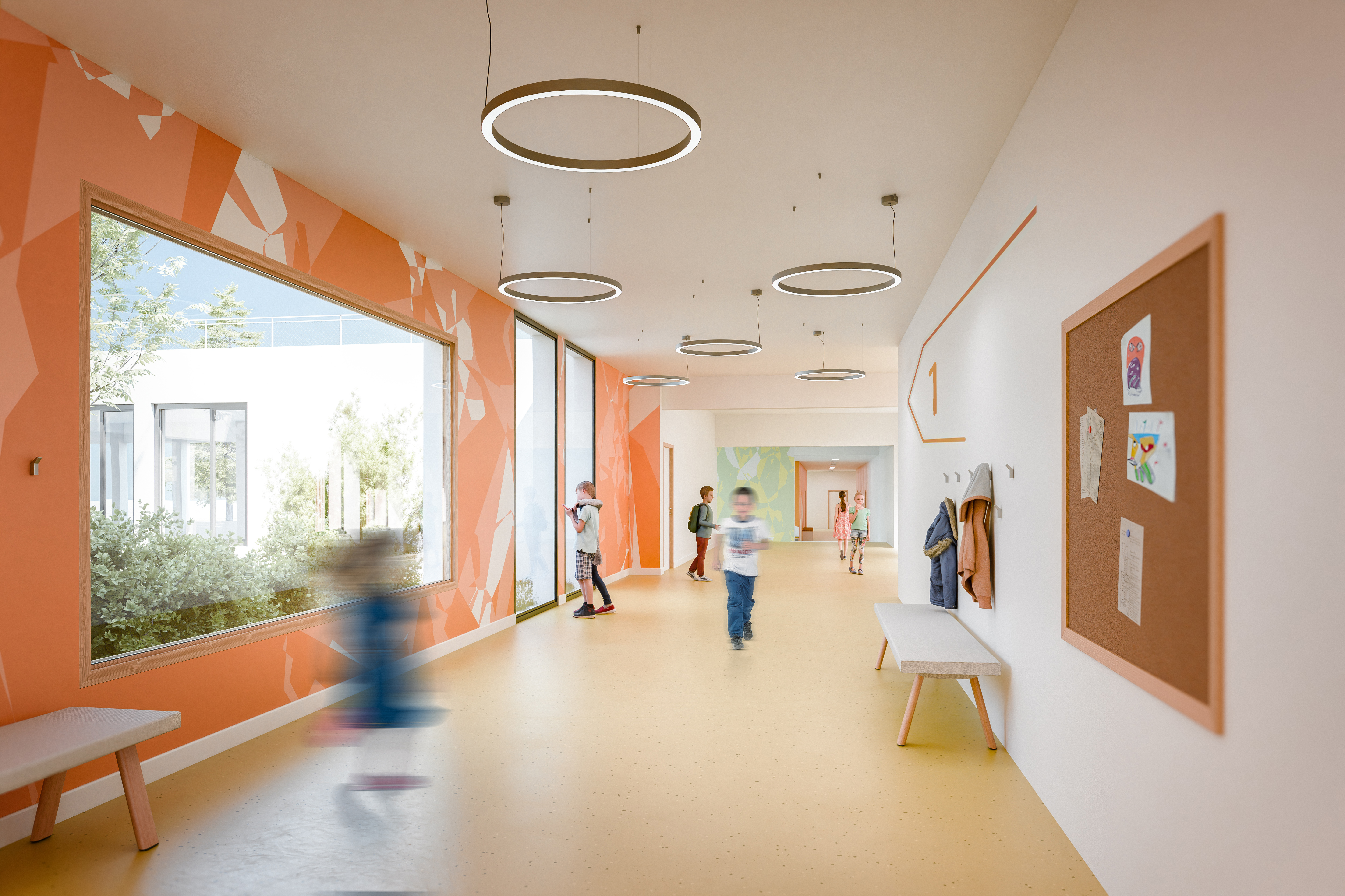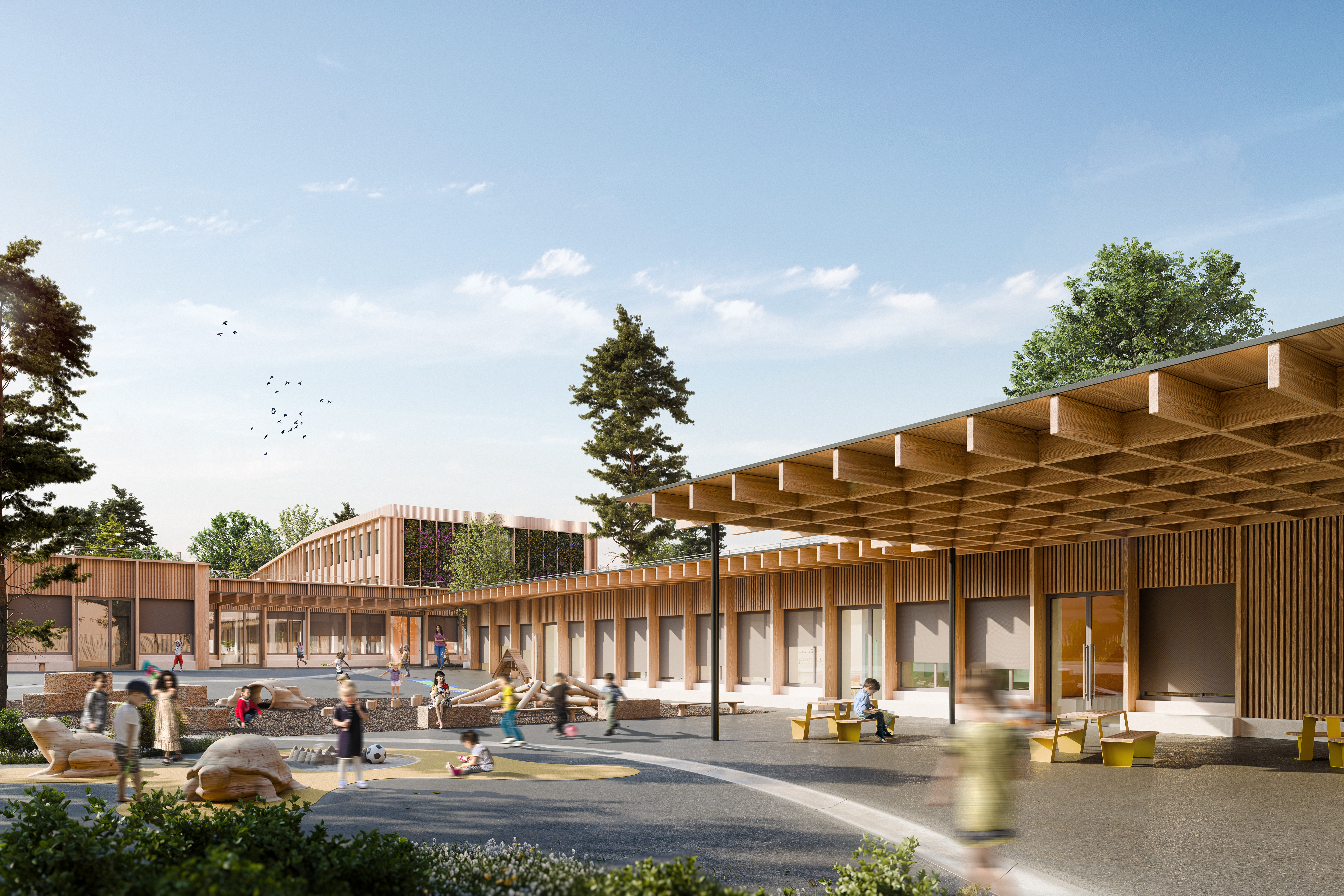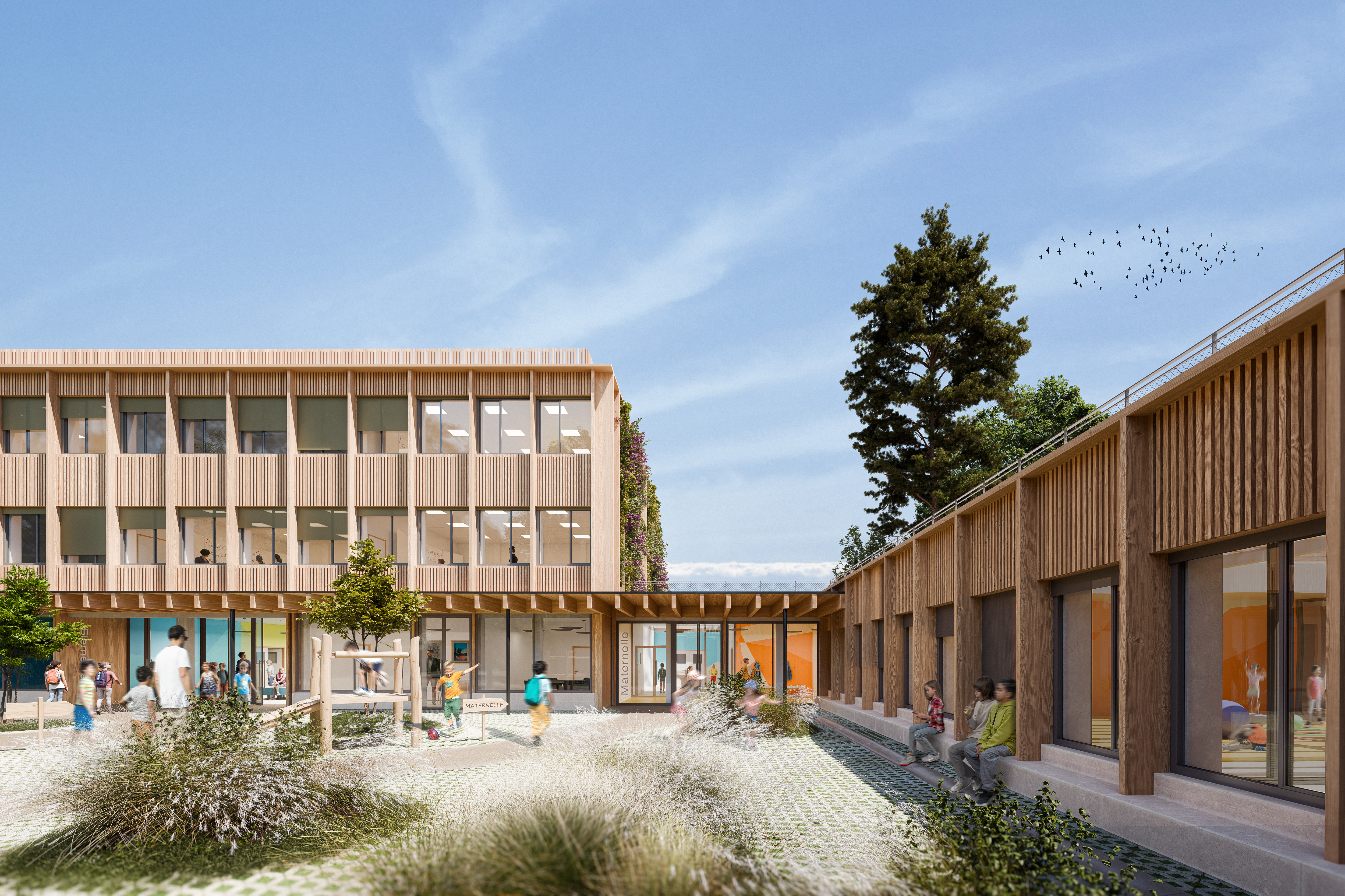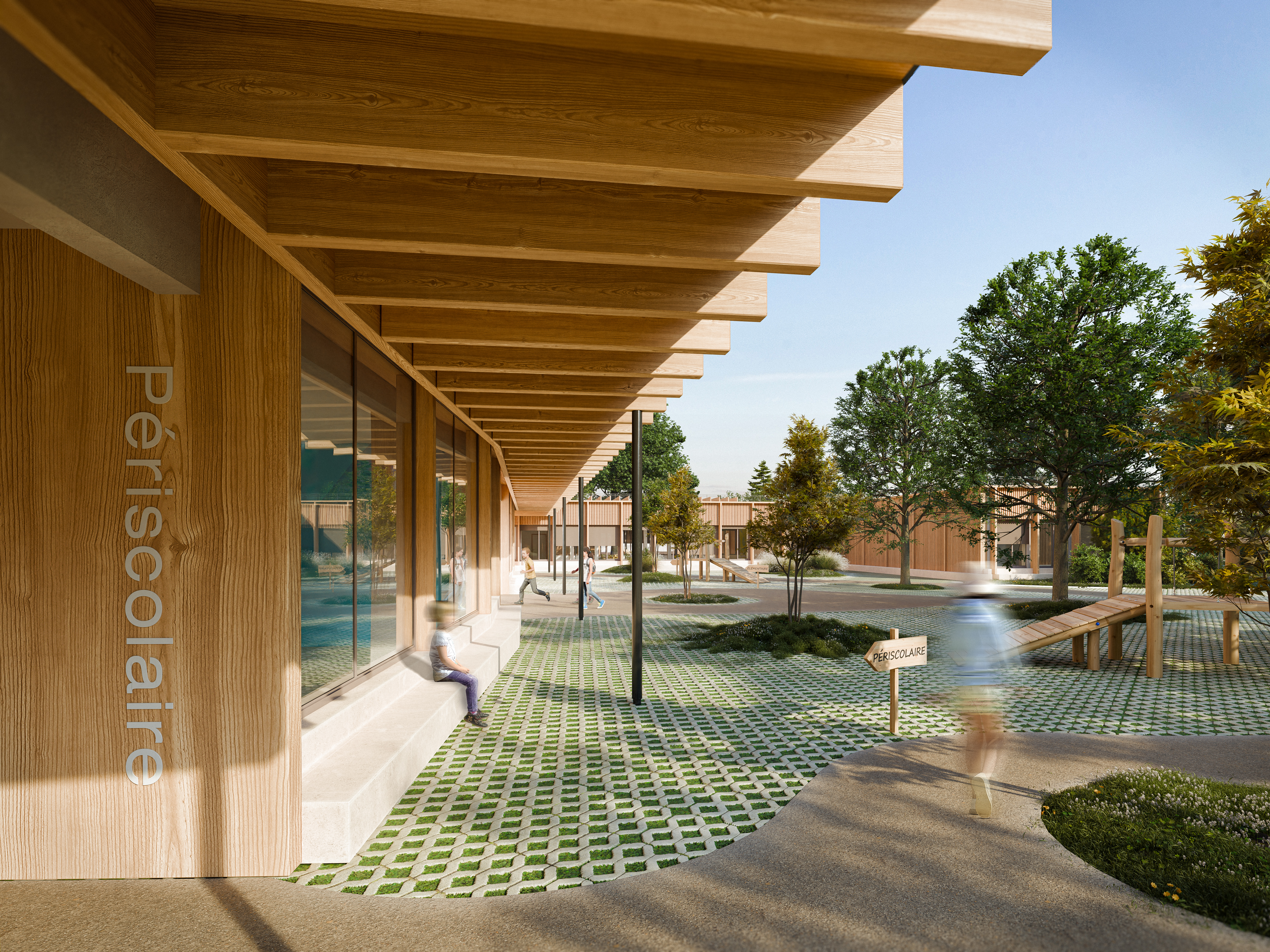 Le projet de restructuration du groupe scolaire Gérard Philipe vise à requalifier l’existant afin de créer un équipement scolaire lisible, fonctionnel et cohérent. L’intervention clarifie les accès, améliore les circulations et affirme une identité architecturale homogène. Les espaces sont modernisés pour renforcer le confort, la qualité d’usage et la durabilité de l’ensemble.